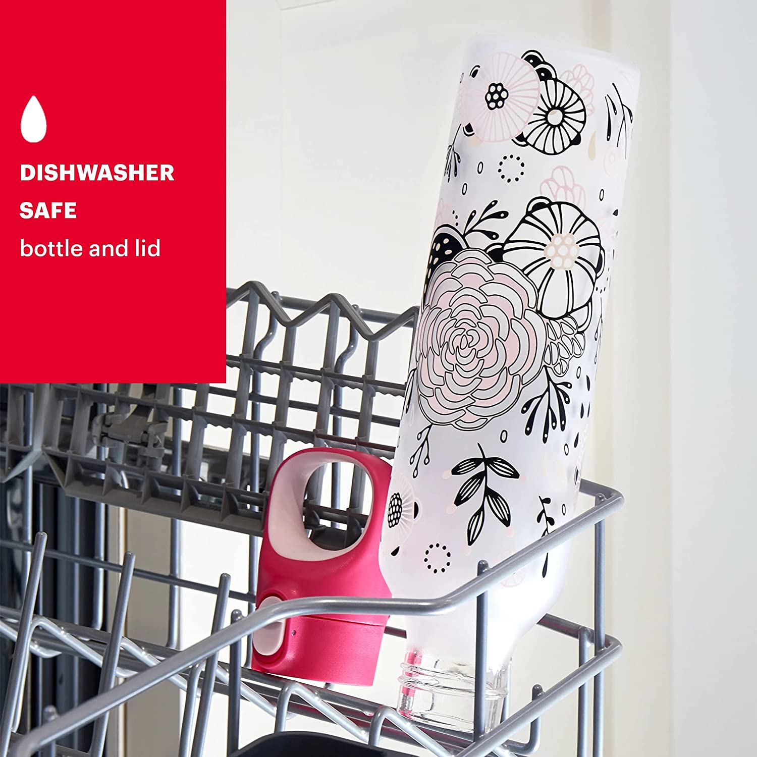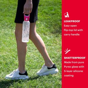 Pyrex 17.5-Oz Color Changing Glass Water Bottle with Silicone Coating, Leakproof and Textured Glass Reusable Water Bottle, Eco-Friendly, BPA-Free Silicone Coating, Floral Pink