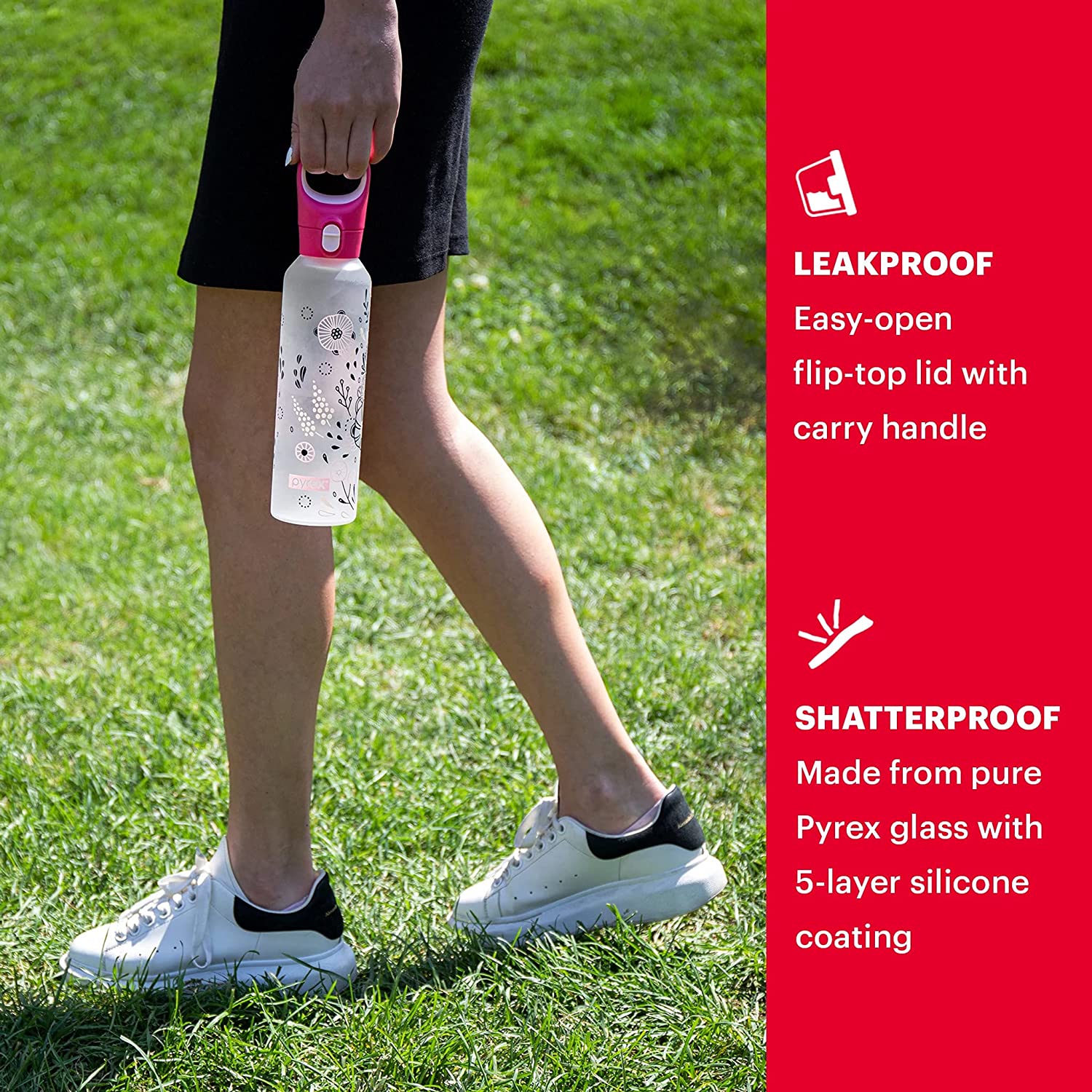 - REUSABLE & RELIABLE: The Pyrex 17.5-oz bottle is a hygienic glass bottle with shatterproof 5-layer silicone safety wall. The leakproof lock cap makes this reusable bottle perfect for your work bag, gym bag or for the kids to use to take to school.