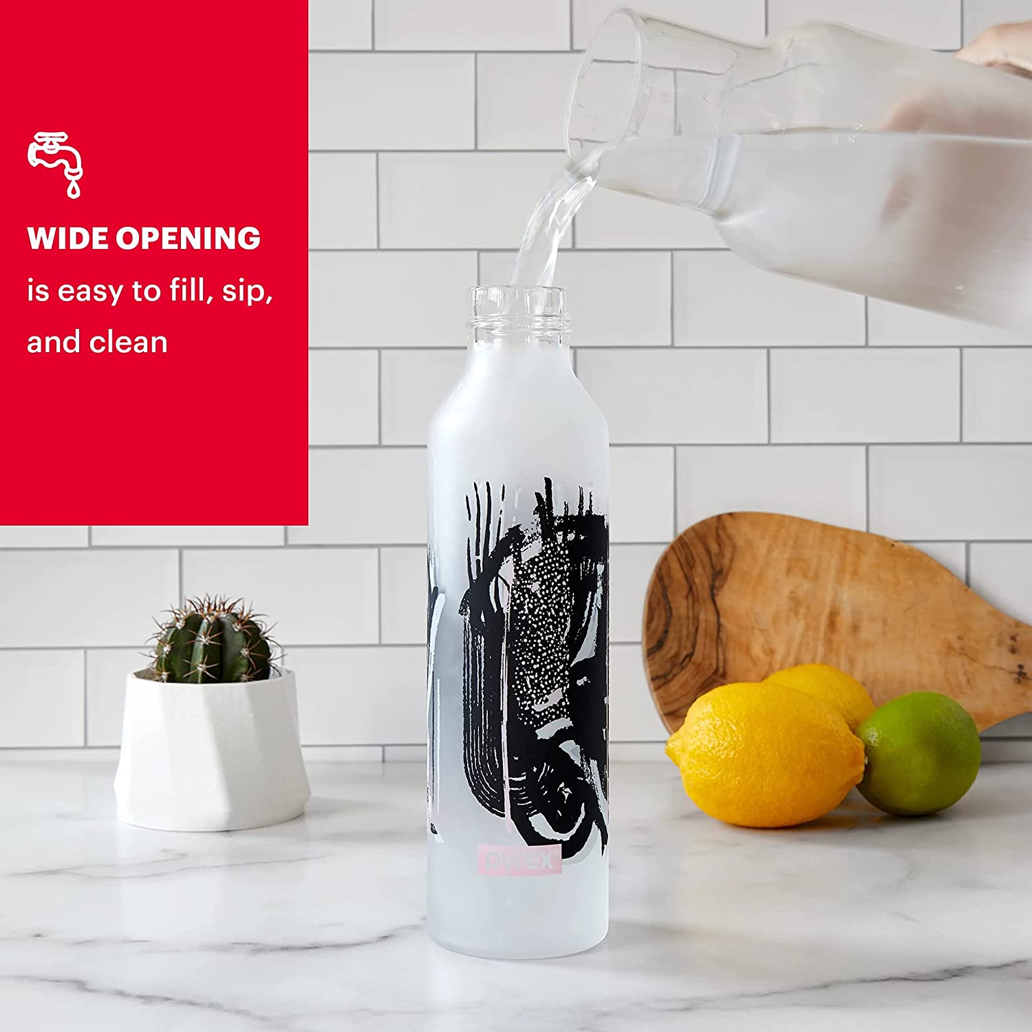 - HIGHLY FUNCTIONAL: The Pyrex reusable water bottle has a break resistant outer body and can be used for a variety of beverages including water, sports drinks, juice, or even tea and coffee. It is also easy to fill and clean, for quick refills.
