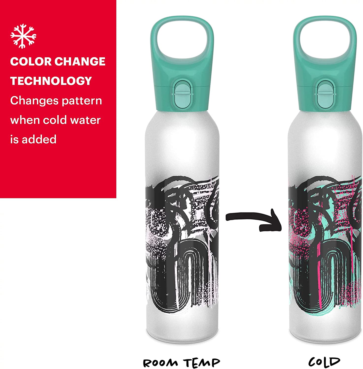 - COLOR-CHANGING: Style and technology blend seamlessly in this 17.5-oz water bottle. Fill it up with cold water and watch as the bottle comes to life with vibrant colors that will make your day.