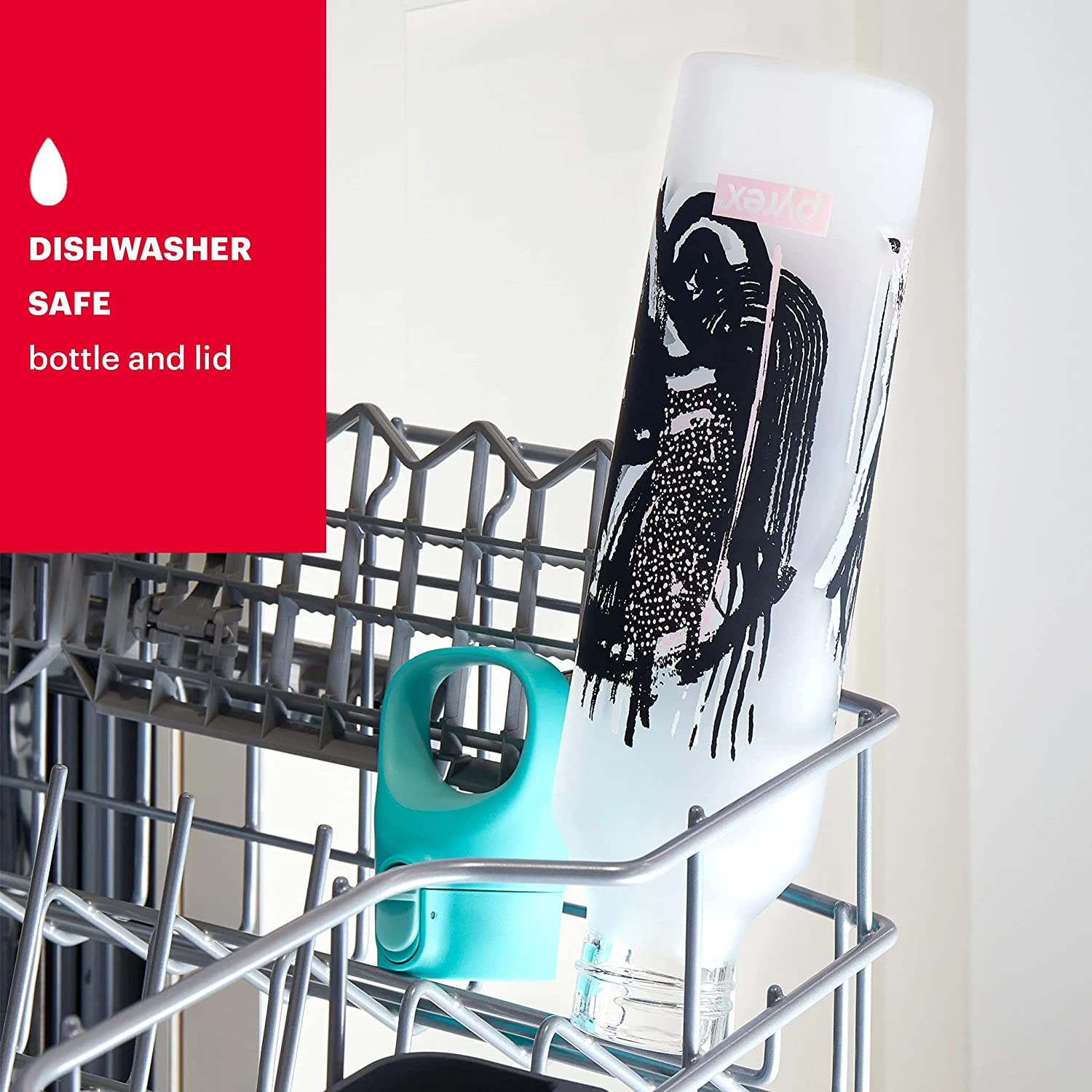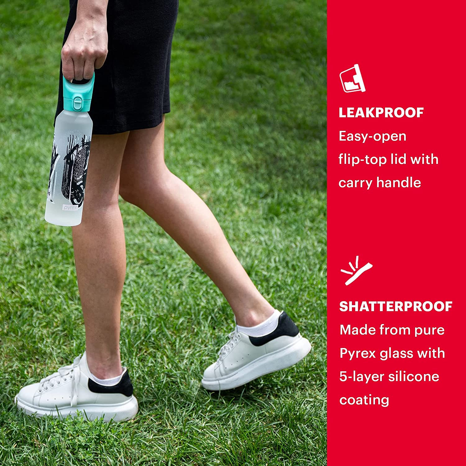 - REUSABLE & RELIABLE: The Pyrex 17.5-oz bottle is a hygienic glass bottle with shatterproof 5-layer silicone safety wall. The leakproof lock cap makes this reusable bottle perfect for your work bag, gym bag or for the kids to use to take to school.