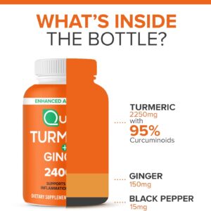 - ENHANCED ABSORPTION FORMULA: Qunol Turmeric capsules contain 2250mg of 95% curcuminoids, 150mg organic ginger root powder, and 15mg black pepper extract to enhance absorption. Other formulations may have only 5% curcuminoids.