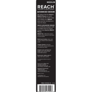 REACH Advanced Design toothbrushes are scientifically designed with a signature angled neck and tapered head to clean hard to reach places. These toothbrushes feature bi-level bristles to help clean and remove plaque between teeth and along the gum line. The signature angled neck extends behind back teeth 60% further than other leading brushes. REACH Advanced Design toothbrushes also feature an ergonomic rubber grip for better comfort and control with brushing.