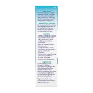 KEEP OUT OF REACH OF CHILDREN. Replens External Comfort Gel is not a contraceptive and does not contain a spermicide. Keep out of eyes and ears. Do not ingest. If vaginal irritation occurs, discontinue use. If symptoms persist, contact your physician. If pregnant of breast-feeding, consult your healthcare provider before use. Store at room temperature.