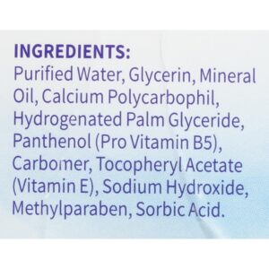 Purified Water, Glycerin, Mineral Oil, Calcium Polycarbophil, Hydrogenated Palm Glyceride, Panthenol (Pro Vitamin B5), Carbomer, Tocopheryl Acetate (Vitamin E), Sodium Hydroxide, Methylparaben, Sorbic Acid.