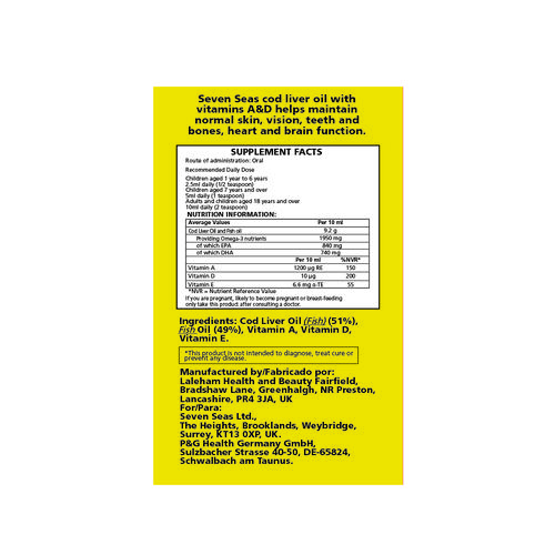 Seven Seas Cod Liver Oil liquid is the perfect nutritional supplement to maintain your health naturally. It contains Omega 3 with EPA and DHA offering numerous benefits for the important formative years of children. A teaspoon a day will keep the doctor at bay.