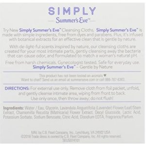 - Made with simple ingredients that gently remove the bacteria that can cause odor, Simply Summerâs Eve silky smooth cleansing cloths are free of harsh chemicals, dyes, alcohol and parabens – so you can feel good about what you are putting on your body