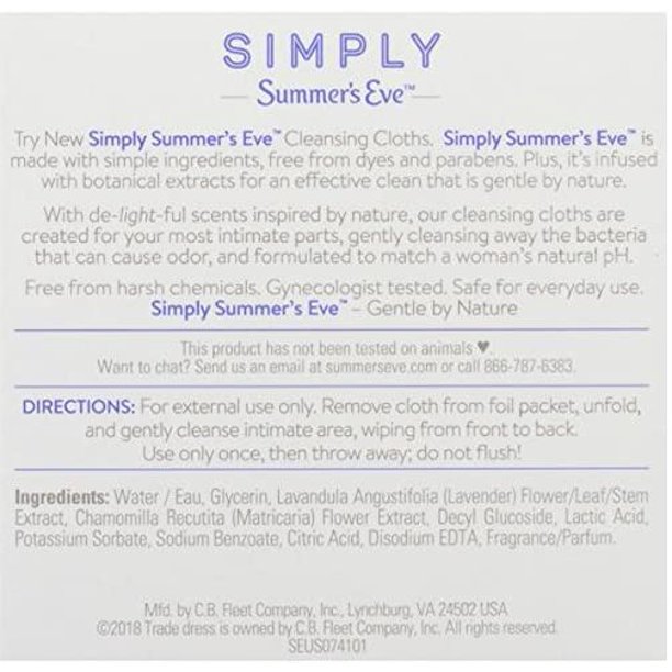 Made with simple ingredients that gently remove the bacteria that can cause odor, Simply Summerâs Eve silky smooth cleansing cloths are free of harsh chemicals, dyes, alcohol and parabens – so you can feel good about what you are putting on your body