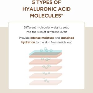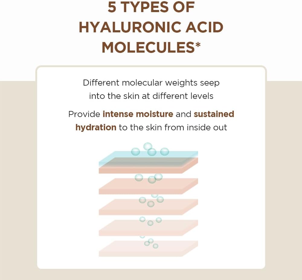 Contains 5 sizes of hyaluronic acid molecules to layer moisture into the skin from the inside out.