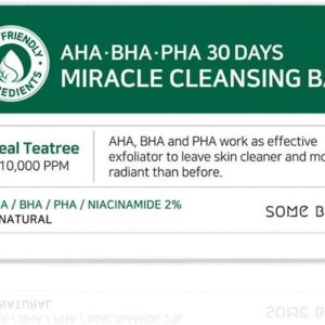 30 day miracle cleansing bar: Glycerin, water, propylene glycol, sodium palmitate, sodium stearate, potassium laurate, sodium laurate, coco-betaine, disodium laureth sulfosuccinate, sucrose, sorbitol, decyl glucoside, niacinamide, chlorella vulgaris powder, melaleuca alternifolia (tea tree) leaf oi, melaleuca alternifolia (tea tree) extract, stearic acid, citric acid (5,000 ppm), salicylic acid (5,000 ppm), hordeum vulgare leaf powder, houttuynia cordata extract, glycyrrhiza