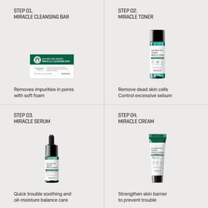 - MIRACLE SERUM : Miracle serum contains high-content tea tree water extract (10,000 ppm) to control sebum and care for pores, 14.5% Asiatic Pennywort extract for soothing, strengthening skin barrier and trouble marks care. pH5.5 sub-acidity serum prevents trouble. Free of 20 types of artificial ingredients and contains patent ingredient Multi-X Bsasm Plus (Skin protecting ingredient)