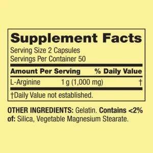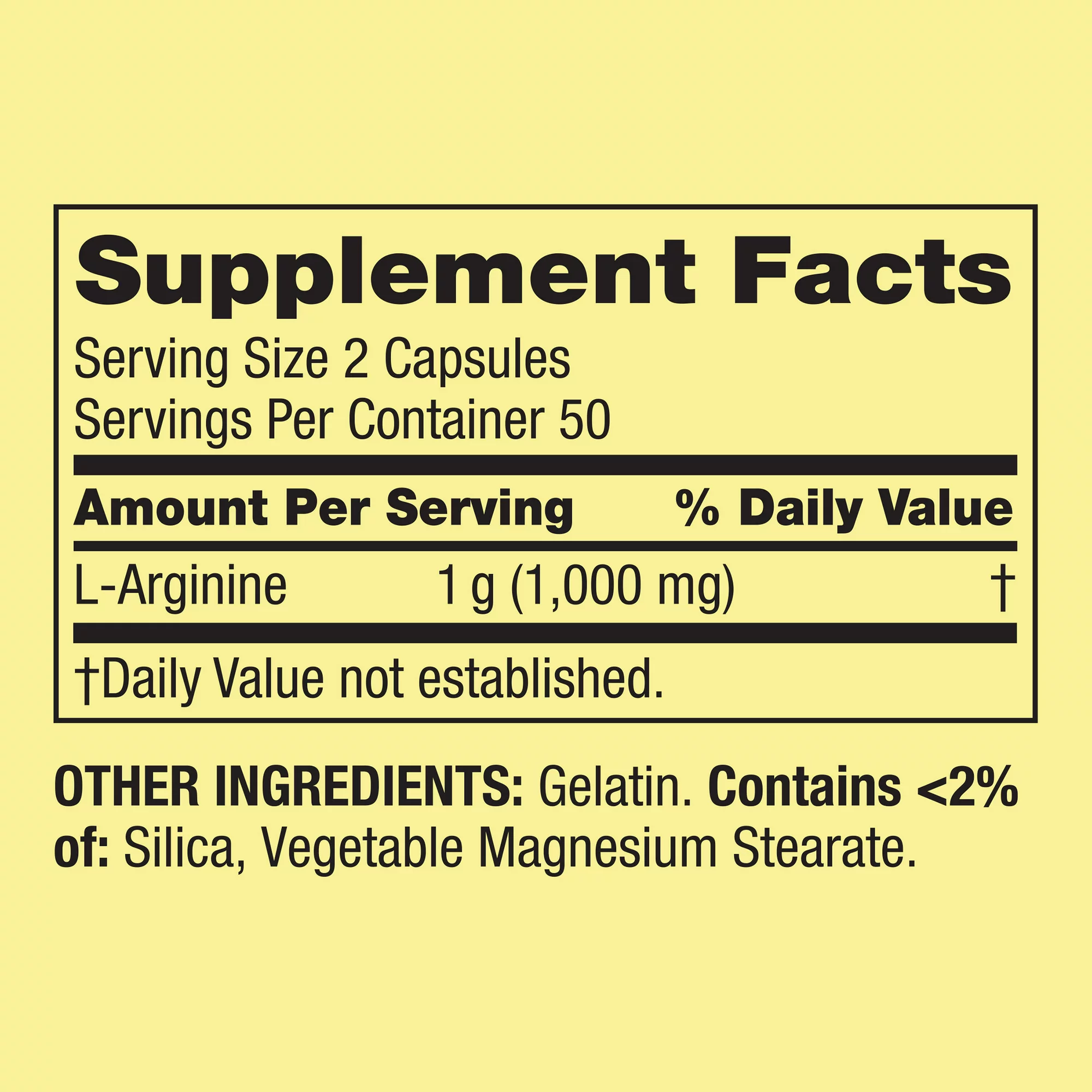 Spring Valley L-Arginine Dietary Supplement Capsules are a dietary supplement designed to provide heart health support.* L-Arginine is an amino acid that stimulates the production of nitric oxide and supports cardiovascular health.* Suggested adult dosage is two capsules three times daily, preferably in between meals. These capsules are free from gluten, yeast, wheat, milk or milk derivatives, lactose, sugar, soy, artificial colors and flavors, and contain less than 5 milligrams of sodium per serving. You can rest assured that Spring Valley L-Arginine Dietary Supplement Capsules are produced with strict quality guidelines and backed by our quality guarantee.