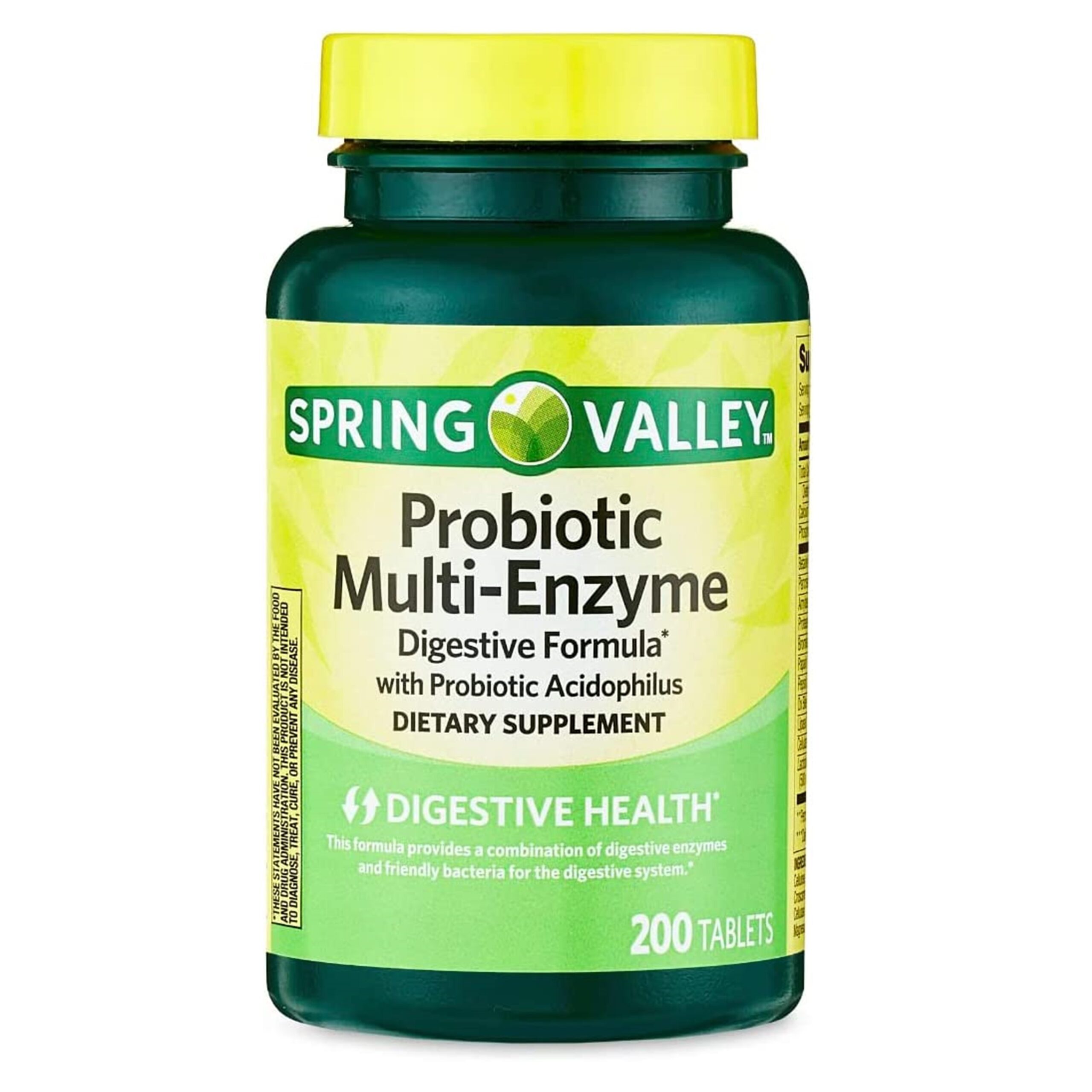Spring Valley Probiotic Multi-Enzyme Digestive Formula* Tablets Dietary Supplement, 200 count Dietary Supplement This Spring Probiotic Multi-Enzyme Digestive Formula with probiotic acidophilus contains a combination of digestive enzymes such as betaine hydrochloride, pancreatin, amylase, protease (papaya enzyme), bromelain, papain (papaya enzyme), pepsin, ox bile, lipase, cellulase, and friendly bacteria lactobacillus acidophilus La-14 that may support the digestive system.* These tablets contain no artificial colors or flavors, artificial sweeteners, preservatives, egg, high fructose corn syrup, lactose, milk or milk derivatives, peanuts, sodium (less than 5 mg), fish, shellfish, talc, or trans fat.
