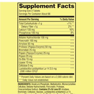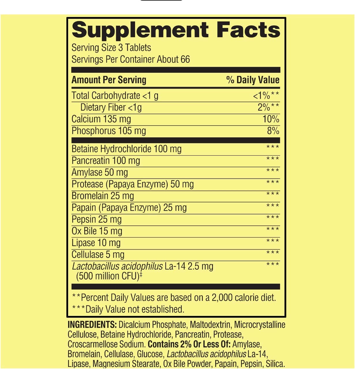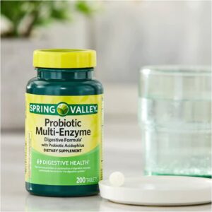 Spring Valley Probiotic Multi-Enzyme Digestive Formula* Tablets Dietary Supplement, 200 count Dietary Supplement This Spring Probiotic Multi-Enzyme Digestive Formula with probiotic acidophilus contains a combination of digestive enzymes such as betaine hydrochloride, pancreatin, amylase, protease (papaya enzyme), bromelain, papain (papaya enzyme), pepsin, ox bile, lipase, cellulase, and friendly bacteria lactobacillus acidophilus La-14 that may support the digestive system.* These tablets contain no artificial colors or flavors, artificial sweeteners, preservatives, egg, high fructose corn syrup, lactose, milk or milk derivatives, peanuts, sodium (less than 5 mg), fish, shellfish, talc, or trans fat. Support your digestive health with Spring Valley Probiotic Multi-Enzyme Digestive Formula Tablets!* Spring Valley understands living a healthy, balanced lifestyle is the key to being your best self. With an affordable range of products inspired by nature, Spring Valley supports your and your family’s health and holistic well-being. Spring Valley Probiotic Multi-Enzyme Digestive Formula* Tablets Dietary Supplement, 200 count: Digestive formula with probiotic acidophilus* With a combination of digestive enzyme and friendly bacteria for the digestive health* No artificial colors or flavors, artificial sweeteners, preservatives, egg, high fructose corn syrup, lactose, milk or milk derivatives, peanuts, sodium (less than 5 mg), fish, shellfish, talc, or trans fat 3 tablets per day Over 2 months (about 66 days) supply