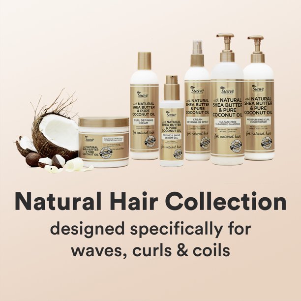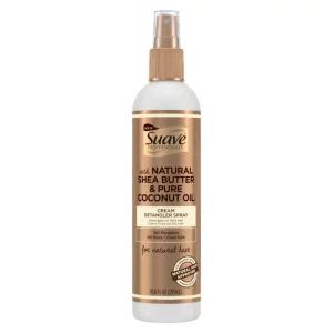 To create the right products for natural hair, Suave asked the experts. Introducing the NEW Suave Professionals Collection for Natural Hair â a range inspired by and made for women with natural hair. Collaborating with over 5,000 women with natural hair to craft, test, and adapt formulas, Suave developed a collection of moisture rich products specifically designed for women with curls, coils, and waves – free of any sulfates, parabens, or dyes. The formulas are also color safe. Each moisture-rich formula is infused with natural shea butter, known to deeply moisturize, and pure coconut oil to help fight frizz, reduce breakage, and enhance shine. The collection nourishes and repairs natural hair and helps Suave women embrace curls, coils, and waves alike. This Cream Detangler Spray can be used on both wet and dry hair. When used on wet hair, it helps to detangle and soften for easy manageability. When used on dry hair on non-wash days, it helps revive hairâs natural curl pattern while adding moisture and shine