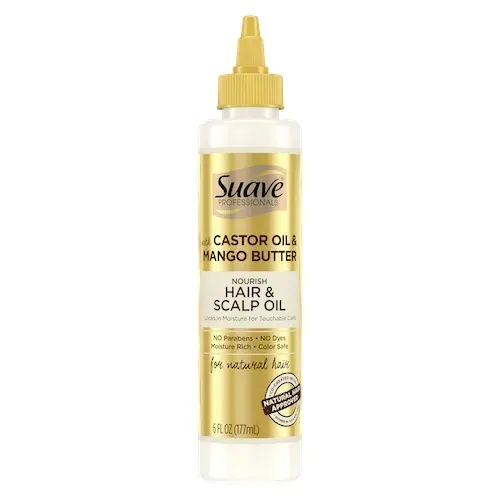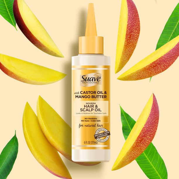 - This Suave Professionals for Natural Hair product is a hair oil for dry scalp infused with Castor oil, known to promote hair growth, and mango butter to help seal in moisture to prevent breakage.