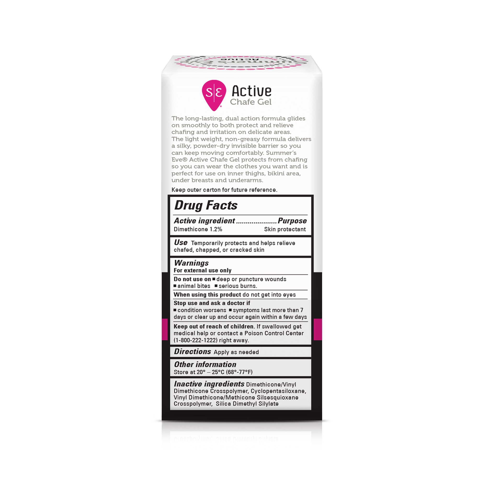 The long-lasting, dual action formula glides on smoothly and dries to a silky, powder dry feel to both protect and relieve chafing and irritation on delicate areas. The light weight, non-greasy formula creates an invisible barrier so you can keep moving comfortably. Summer’s Eve® Active Chafe Gel protects from chafing so you can wear the clothes you want and is perfect for use on inner thighs, bikini area, under breasts and underarms.