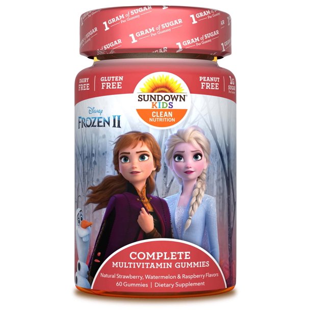 Sundown Kids Disney Frozen 2 complete MULTIVITAMIN gummies taste great, come in fun Disney character shapes and are full of clean nutrition you can count on. Naturally sourced fruit flavors and colors. Free Of Gluten, dairy and peanuts.