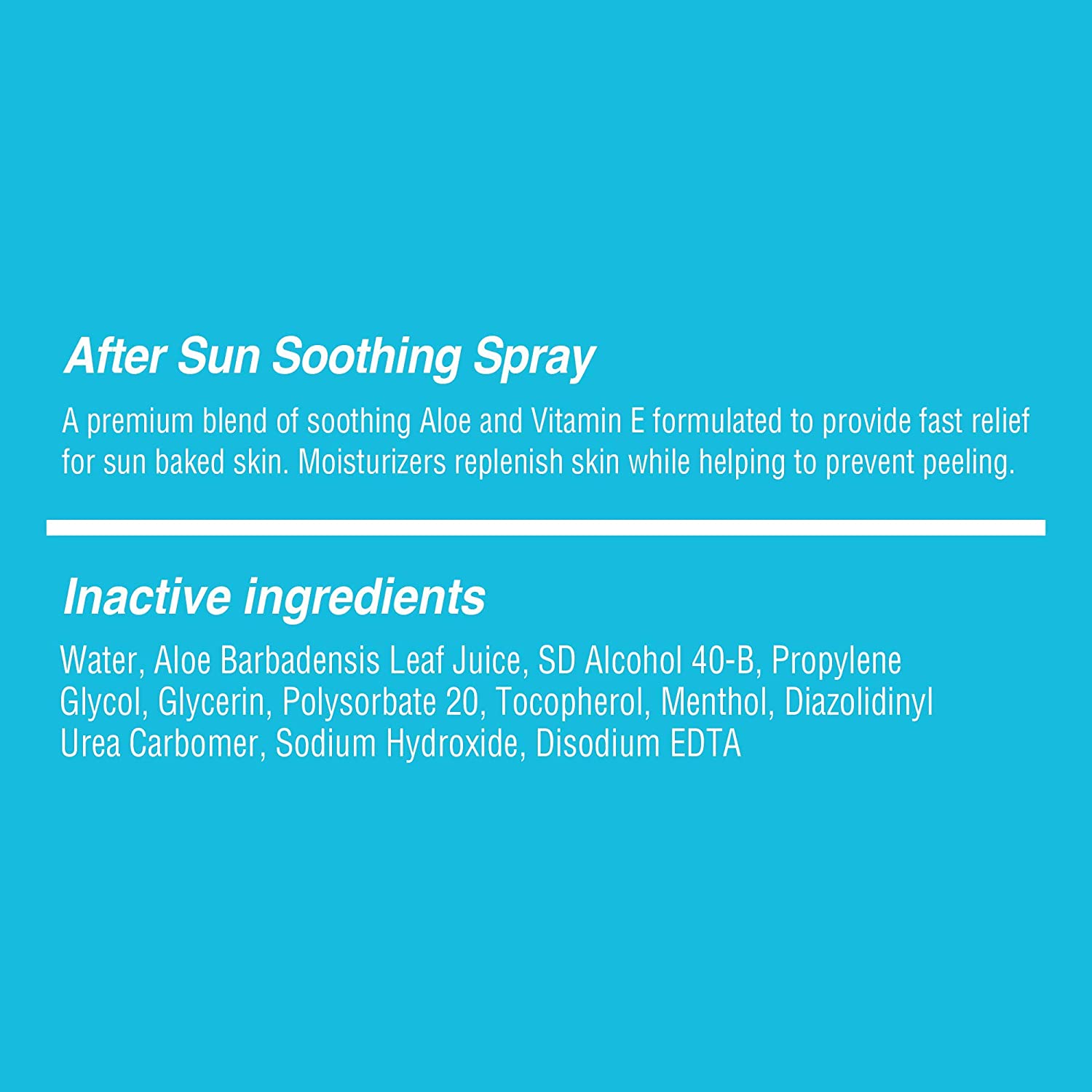 - Aloe Sunburn Relief Great For Skin Repair: Pure Aloe spray moisturizer for body provides you sunburn relief from a day playing in outdoor. Instant Cooling Relief, Non Greasy, Vitamin E Enriched, Gluten & Oil Free, Hypoallergenic & Dermatologist Tested.