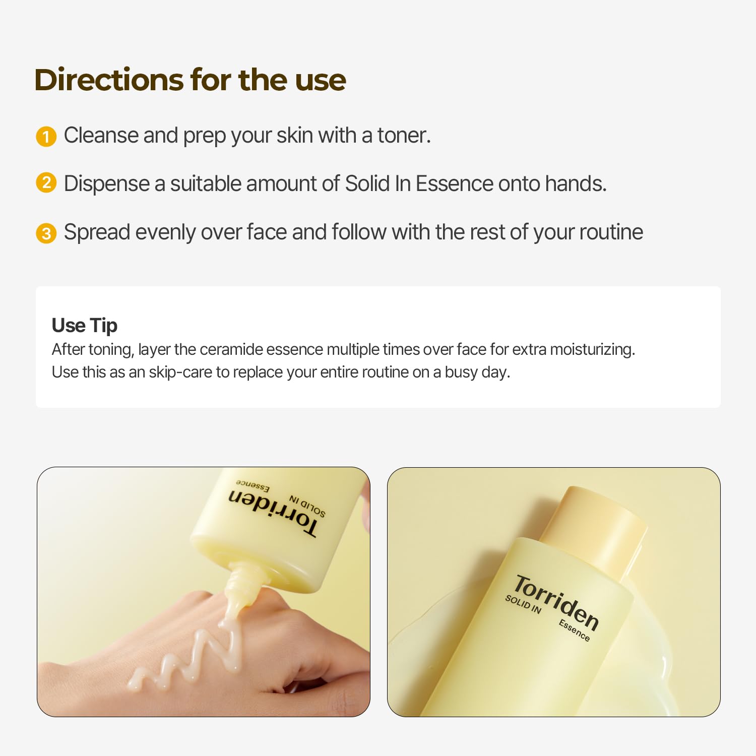 - Clinical Trials performed by Korean Dermatology Lab in 2022 on 22 Participants comfirmed that Torriden Solid In Ceramide Essence increased moisture level by 35.27% instantly and 14.27% under the dermis and reduced moisture loss by 7.79% after 2 weeks of use.