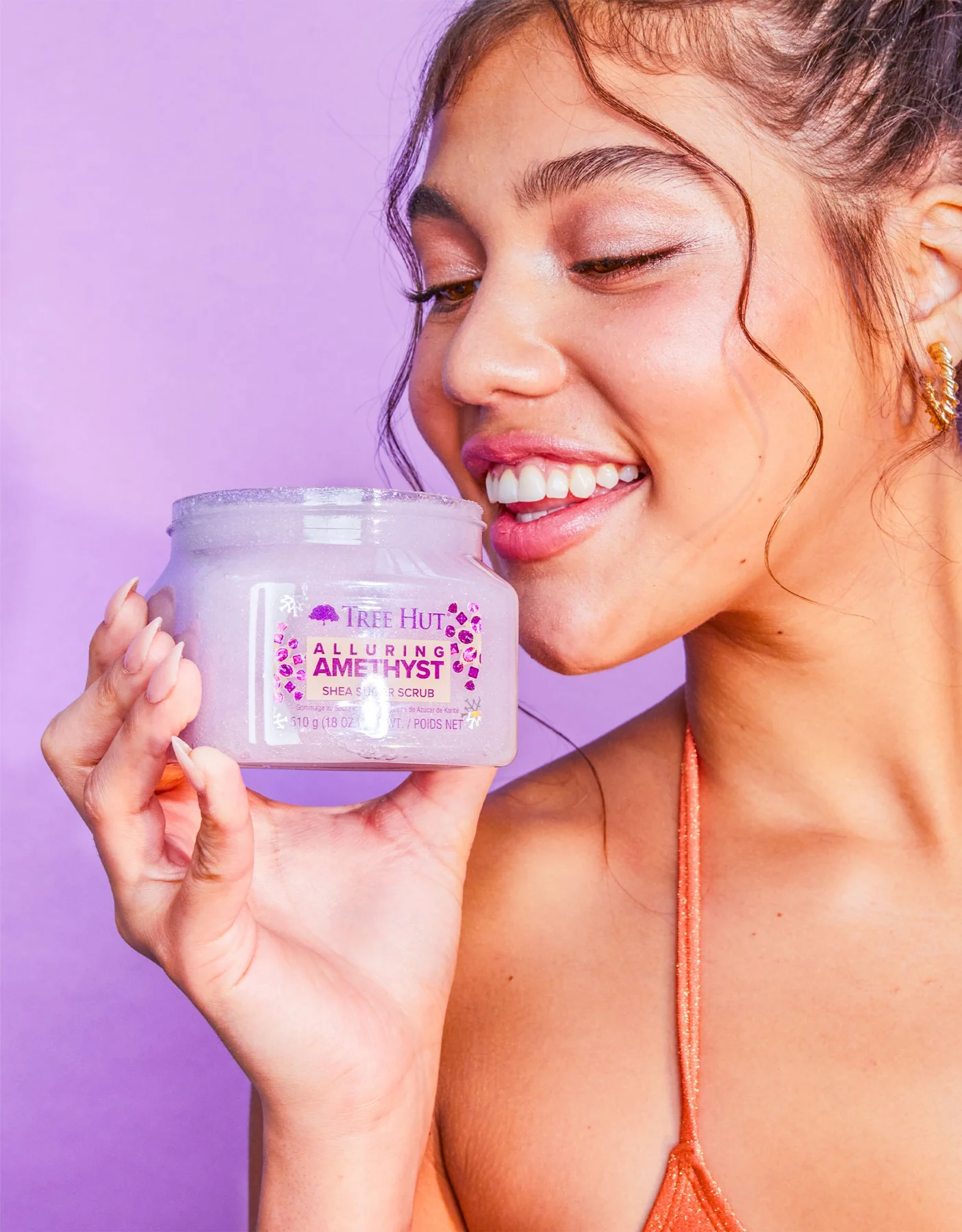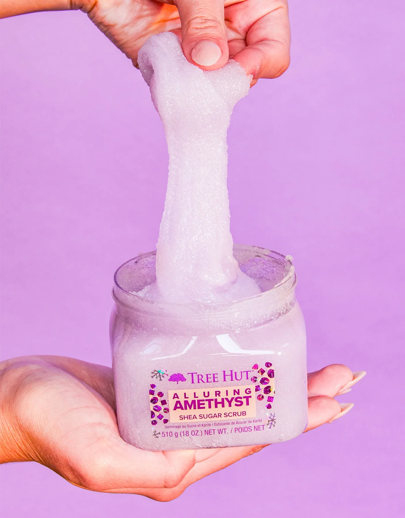 - Boost your shower routine, scrub away the day, and reveal soft, vibrant skin with the sweet and bubbly scent of Tree Hut Alluring Amethyst Scrub.