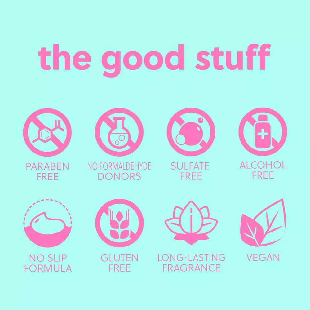 Alcohol-free, formaldehyde-free, gluten-free, paraben-free, sulfate-free, and vegan