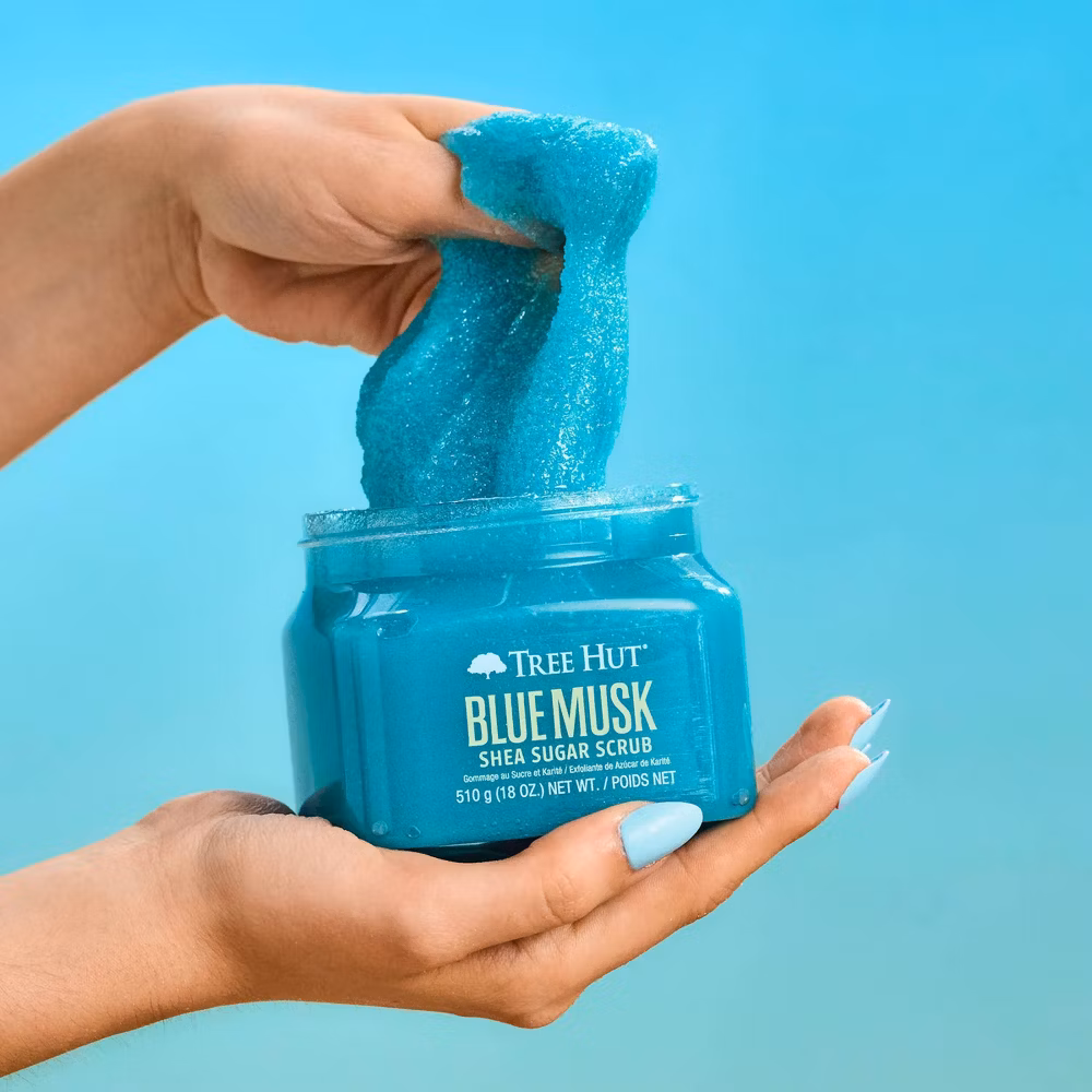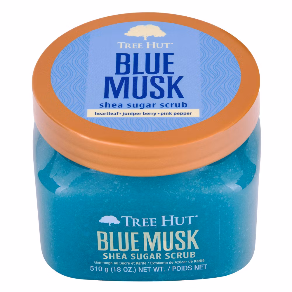 Scrub away the day and reveal soft, glowing skin with our Tree Hut Blue Musk Shea Sugar Scrub! Made with real Sugar, Shea Butter, Heartleaf, Juniper Berry, and a blend of six natural oils, this body scrub deeply nourishes and balances skin’s hydration to help restore skin’s natural glow.