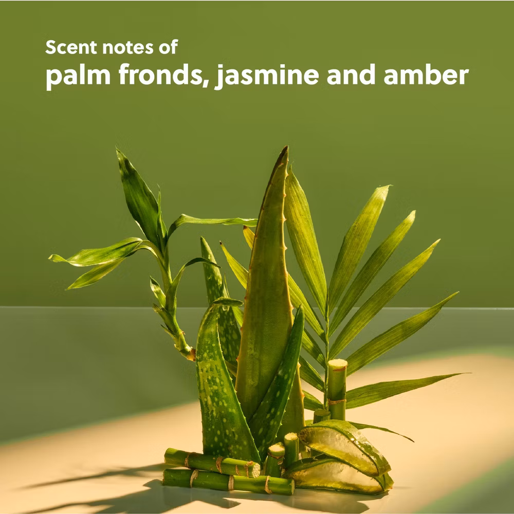 Featuring a relaxing, earthy scent that transports your senses to a sunlit oasis, with notes of palm fronds, jasmine, and amber