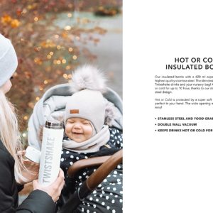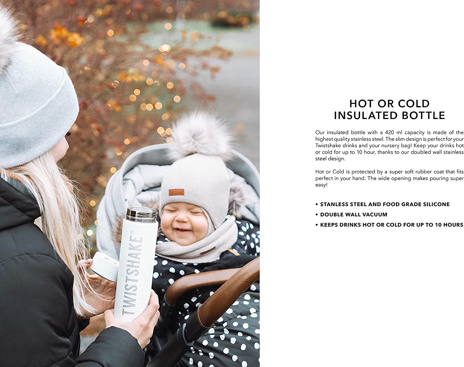 Twistshake’s Hot or Cold – Insulated bottle with a 420ml capacity is made of the highest quality stainless steel. The slim design is perfect for your Twistshake drinks and your nursery bag! Keep your drinks hot or cold for up to 10 hours; thanks to our doubled wall stainless steel design. The bottle is protected by a super soft rubber coat that fits perfect in your hand. The wide opening makes pouring super easy. Dish your Hot or Cold bottle; before first use. Shake and wipe the lid after wash since water can gather inside of the lid. Do not freeze or use in microwave oven.