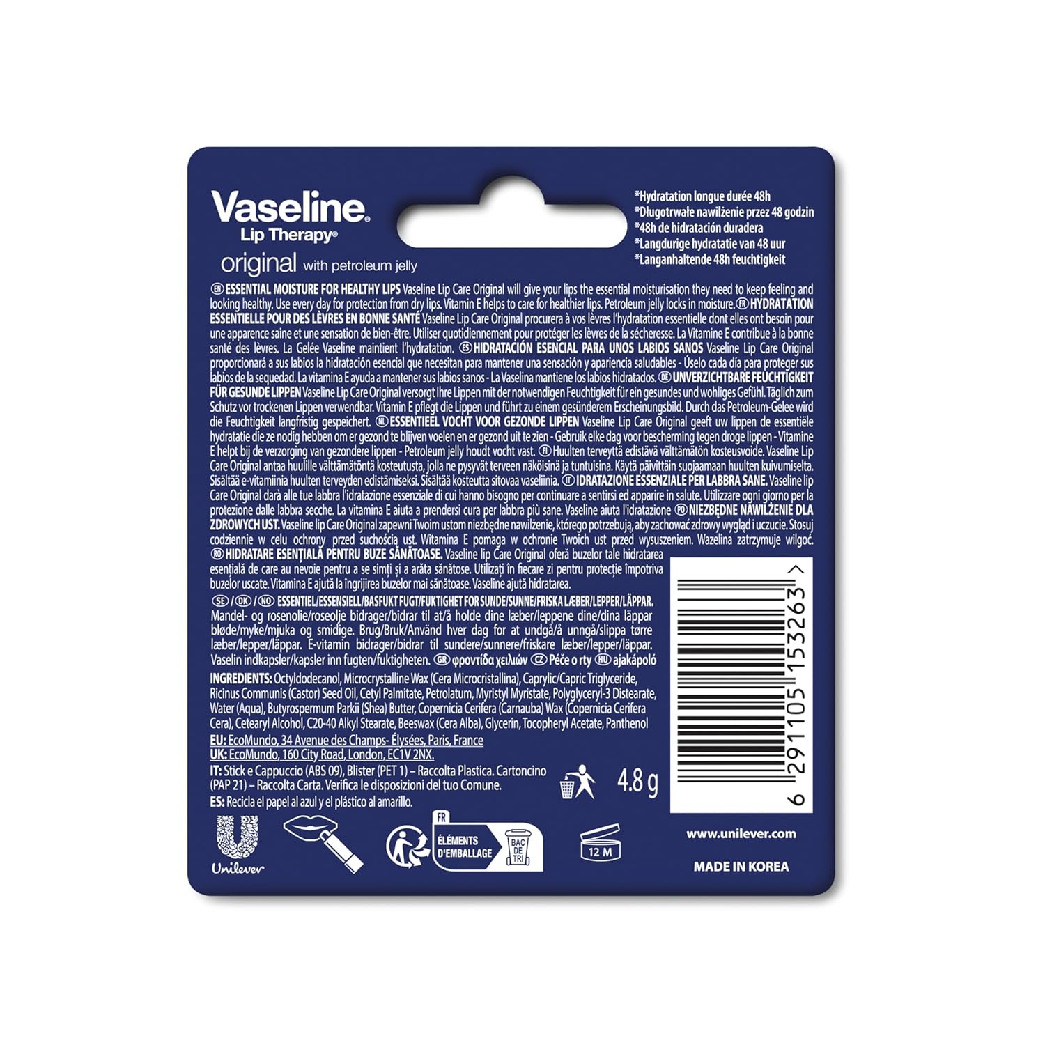 Vaseline Lip Therapy Stick, Original Lip Balm for Soft Lips 4.8g