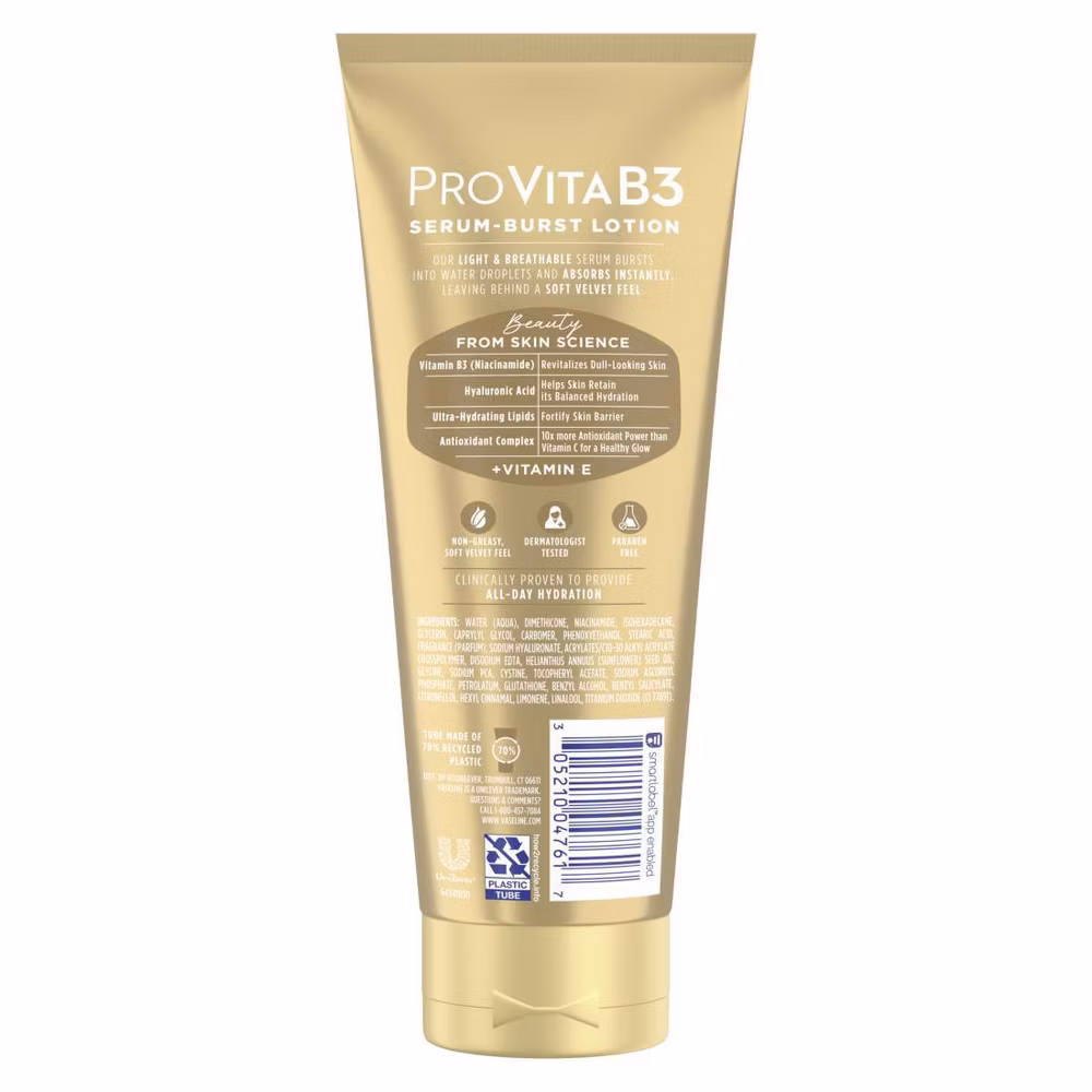 Vaseline Pro VitaB3 Serum Burst Lotion, with10x the antioxidant power of Vitamin C from from our Antioxidant Complex, helps revitalize dull-looking skin for a healthy glow.
