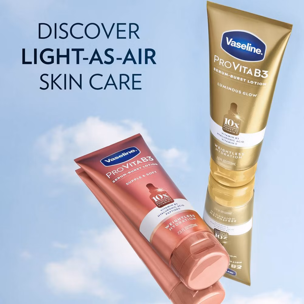 Vaseline Luminous Glow Pro VitaB3 Serum Burst Lotion is a breakthrough in beauty and skin science. Our lotion-to-serum sensory provides all-day weightless hydration that is never-greasy. 9 out of 10 consumers say the product feels light on skin and is easy to apply all over. Vaseline Luminous Glow Pro VitaB3 Serum Burst Lotion is enriched with Vitamin B3 (Niacinamide) that revitalizes dull-looking skin, Hyaluronic Acid that helps skin retain its balanced hydration, Ultra-Hydrating Lipids that fortify the skin barrier, and Vitamin E. Our unique Antioxidant Complex provides 10x more antioxidant power than Vitamin C, giving your skin a healthy glow. Our serum is paraben-free and dermatologist tested, making it safe for all skin types. At Vaseline, we believe in the power of healthy skin. We are committed to developing products with superior efficacy that feel good to use. With Vaseline, there is no other skin you want to live in. For best results, massage liberally into skin daily.