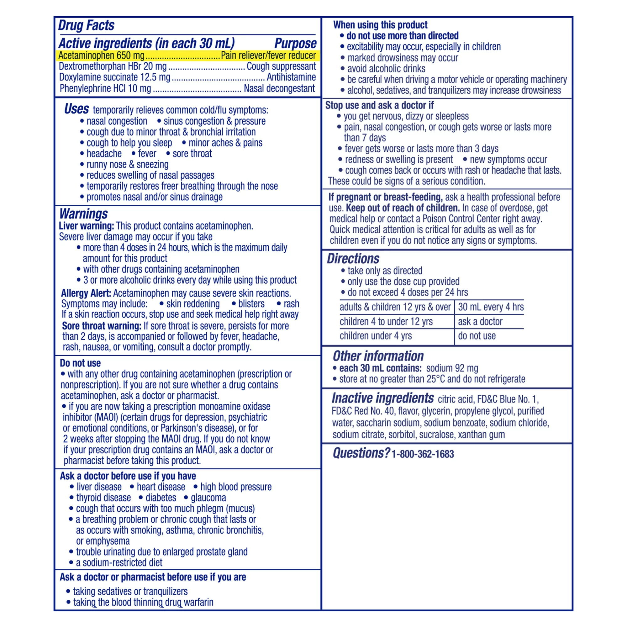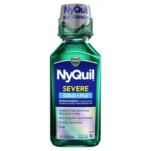 Vicks NyQuil Severe Cold & Flu Nighttime Relief delivers maximum symptom fighting ingredients to relieve your worst cold symptoms. NyQuil SEVERE relieves cough, headache, fever, sore throat, minor aches & pains, nasal congestion, sinus pressure, fever, sneezing & runny nose so you can get the rest you need. Contains acetaminophen.Use as directed. Keep out of reach of children