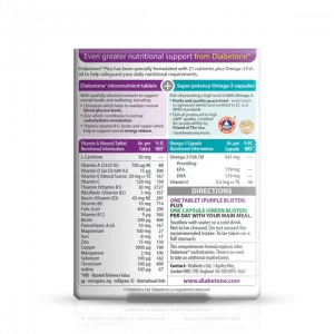 Many people take Omega-3 supplements separately, so now Diabetone Plus Omega-3 takes any confusion out of choosing the right Omega-3 product and provides the additional benefit of a complete multivitamin plus a Omega-3 capsule in a dual pack. The Omega-3 capsules contain over 60% Omega-3 and have been rigorously tested and certified to EC ad WHO standards for guaranteed purity and quality