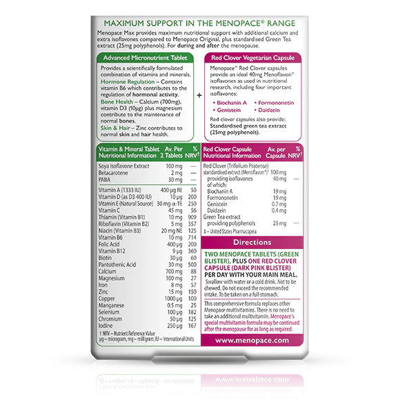 As well as a comprehensive range of micronutrients, vitamins and minerals, Menopace Max also includes a vegetarian capsule with Red Clover and Green Tea extracts.