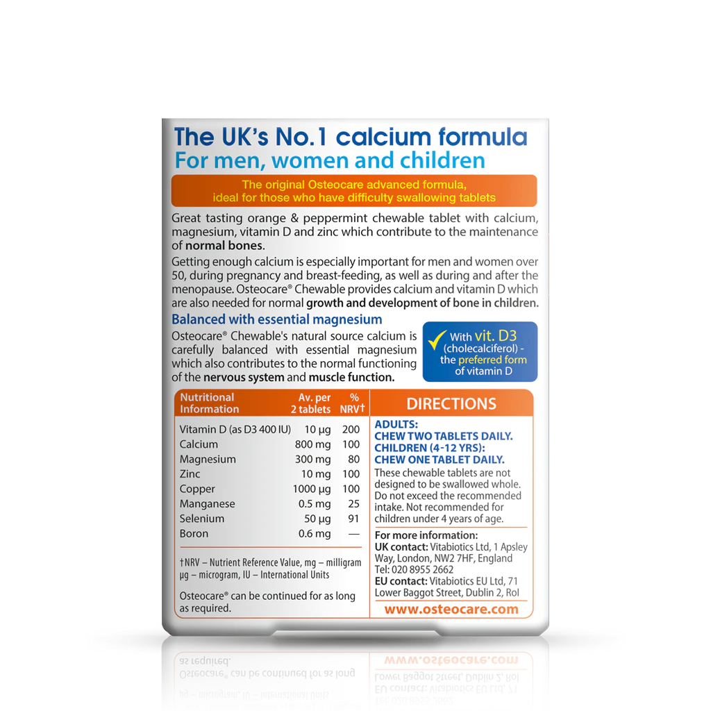 From childhood to later in life, from pregnancy to post-menopause, calcium is critical. If you’re concerned about the gaps in your diet, Osteocare Chewable’s innovative formula is a rich source of calcium, magnesium, vitamin D and zinc which all contribute to the maintenance of normal bones.