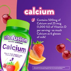 vitafusion Calcium Gummy Vitamins are daily dietary supplements that provide a fusion of essential nutrients, Calcium and Vitamin D3, in a natural fruit-and-cream flavored gummy. Each two-gummy serving supports bone and teeth health with 500 mg of Calcium and 1,000 IU of Vitamin D (1). Each serving of these chewable Calcium vitamin gummies has as much calcium as two 6 fluid ounce glasses of milk. These adult gummy vitamins provide a great tasting and convenient alternative to traditional, hard-to-swallow vitamin pills. Each flavorful and nutritious vitamin gummy is made with no artificial flavors or sweeteners, no gluten, no high fructose corn syrup, no dairy and no synthetic FDC dyes. Look forward to your daily dose of Calcium with vitafusion Calcium gummies. This 100 count bottle of gummy vitamins ensures you’ll have enough to last you 50 days