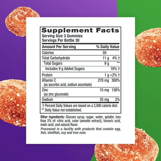 vitafusion Power Zinc Gummy Vitamins are a dietary supplement specially formulated with your health in mind. Each two-gummy serving of these Zinc supplement vitamin gummies contains 15 milligrams of high potency Zinc and 270 milligrams of Vitamin C to help with immune support