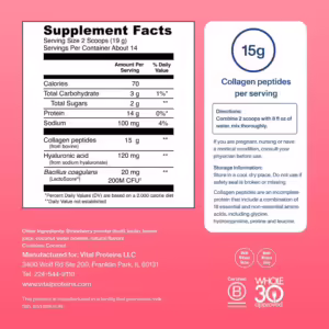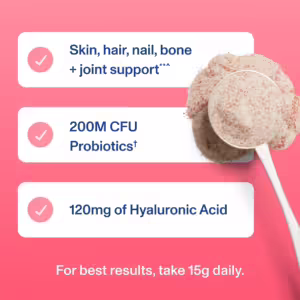 Nourish your inner glow with our Beauty Collagen™ — a deliciously subtle blend of bovine hide collagen peptides, hyaluronic acid, probiotics, organic strawberry and organic lemon — which helps support hair, skin and nails.** **These statements have not been evaluated by the Food and Drug Administration. This product is not intended to diagnose, treat, cure, or prevent any disease.
