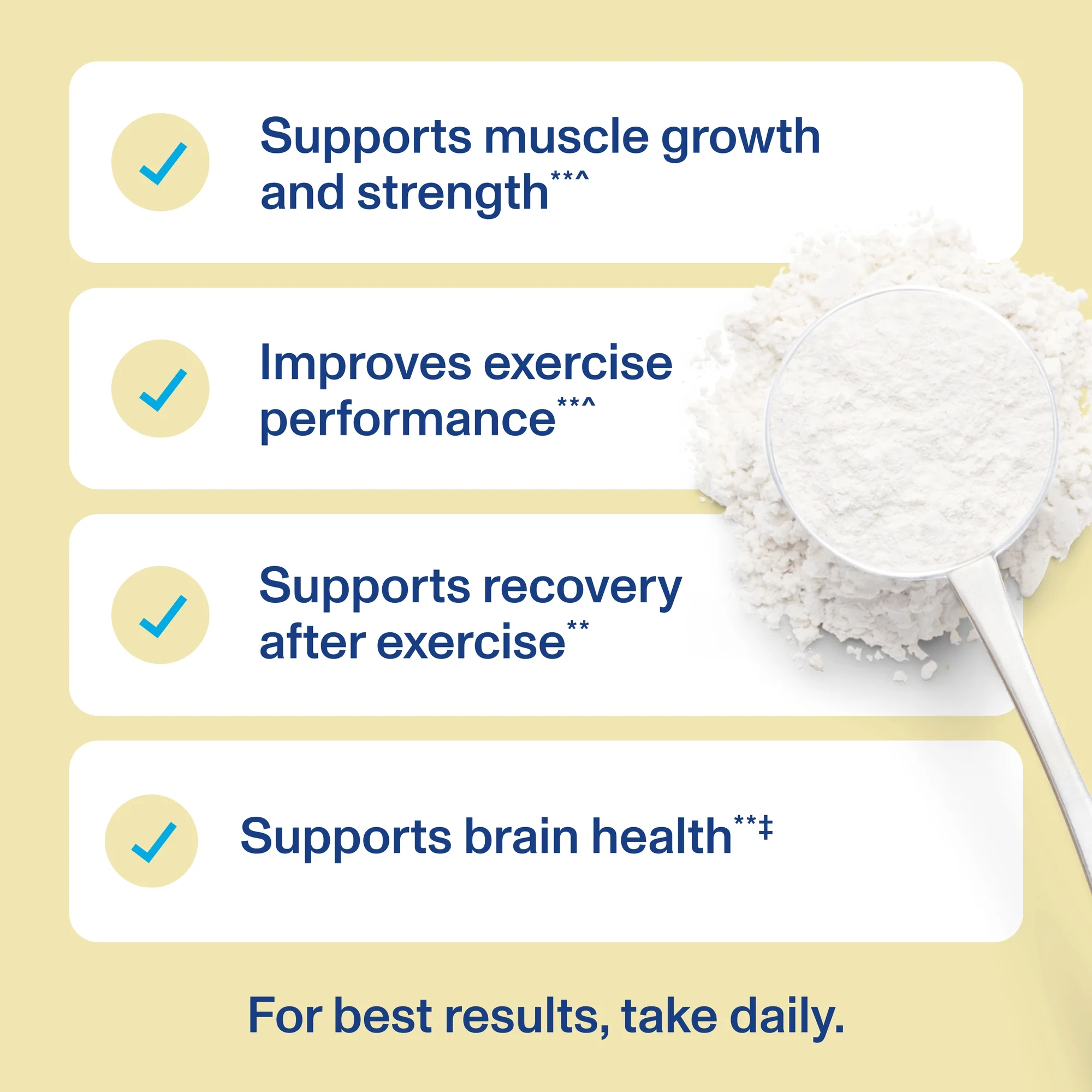 ^In combination with resistance exercise ‡ Studies show that creatine may support brain health in vegetarians and aging individuals ** These statements have not been evaluated by the Food and Drug Administration. This product is not intended to diagnose, treat, cure, or prevent any disease.