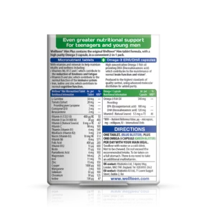 Today’s young adults have more to live up to than ever before, with busy social lives, late nights and early mornings, studying and sports to juggle. Ensuring a healthy, balanced diet is essential but it’s not always a priority in a hectic teenage lifestyle. Wellteen Him Plus has been developed especially for teenagers and young men aged 13-19 years, it provides a comprehensive range of vitamins, minerals, Co-Q10, botanical extract Lycopene, plus a high purity Omega-3 capsule. Omega 3 provides DHA which helps to maintain normal brain function and vision. A beneficial effect is obtained with a daily intake of 250mg of DHA.