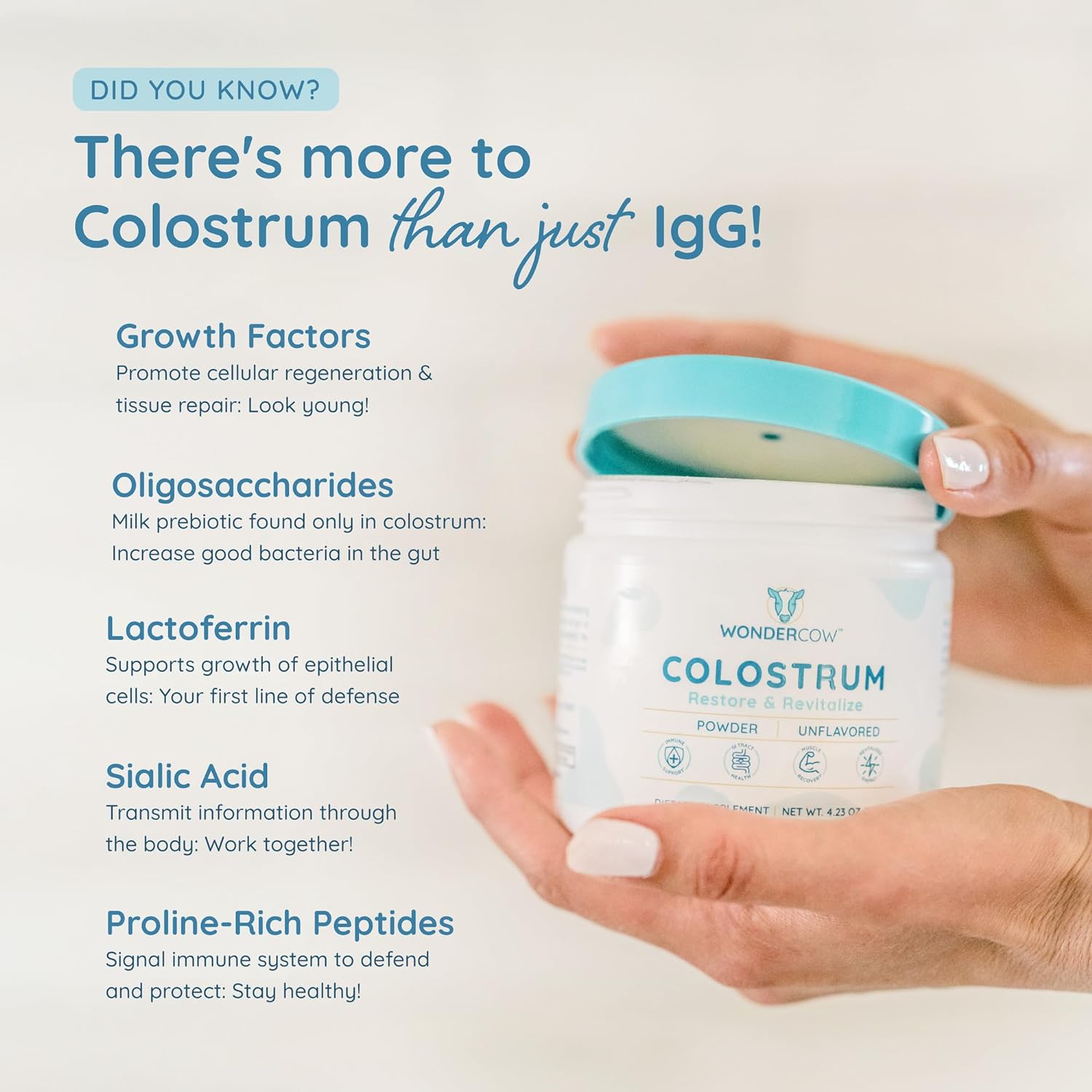 - The Power of Colostrum: Our premium colostrum powder supplement provides a wealth of benefits, including immune system support, improved gut health, enhanced muscle growth and repair, anti-aging properties, restorative sleep, and cognitive function improvement. With its rich array of bioactive compounds such as immunoglobulins, lactoferrin, growth factors, and peptides, our colostrum powder supplement is a true original superfood that supports overall health and wellness.