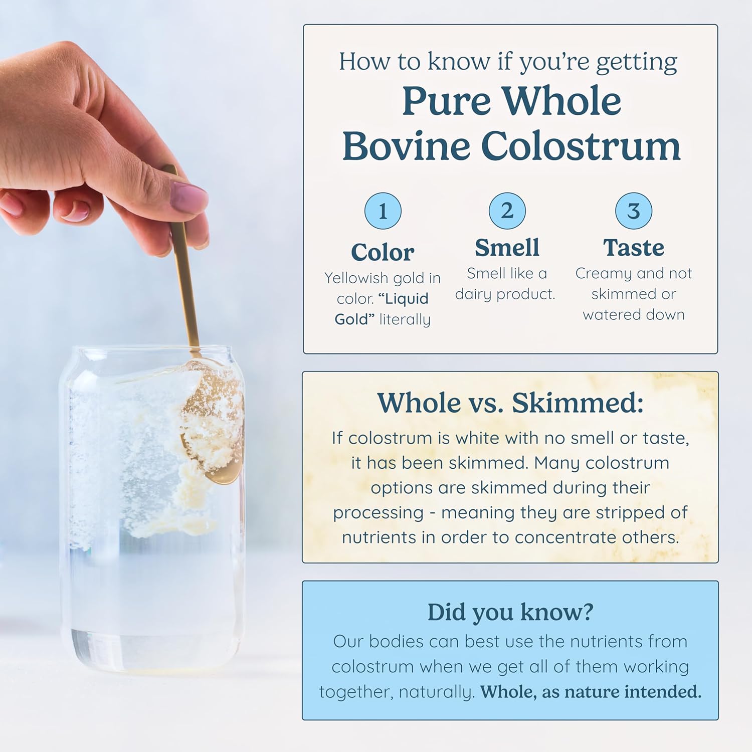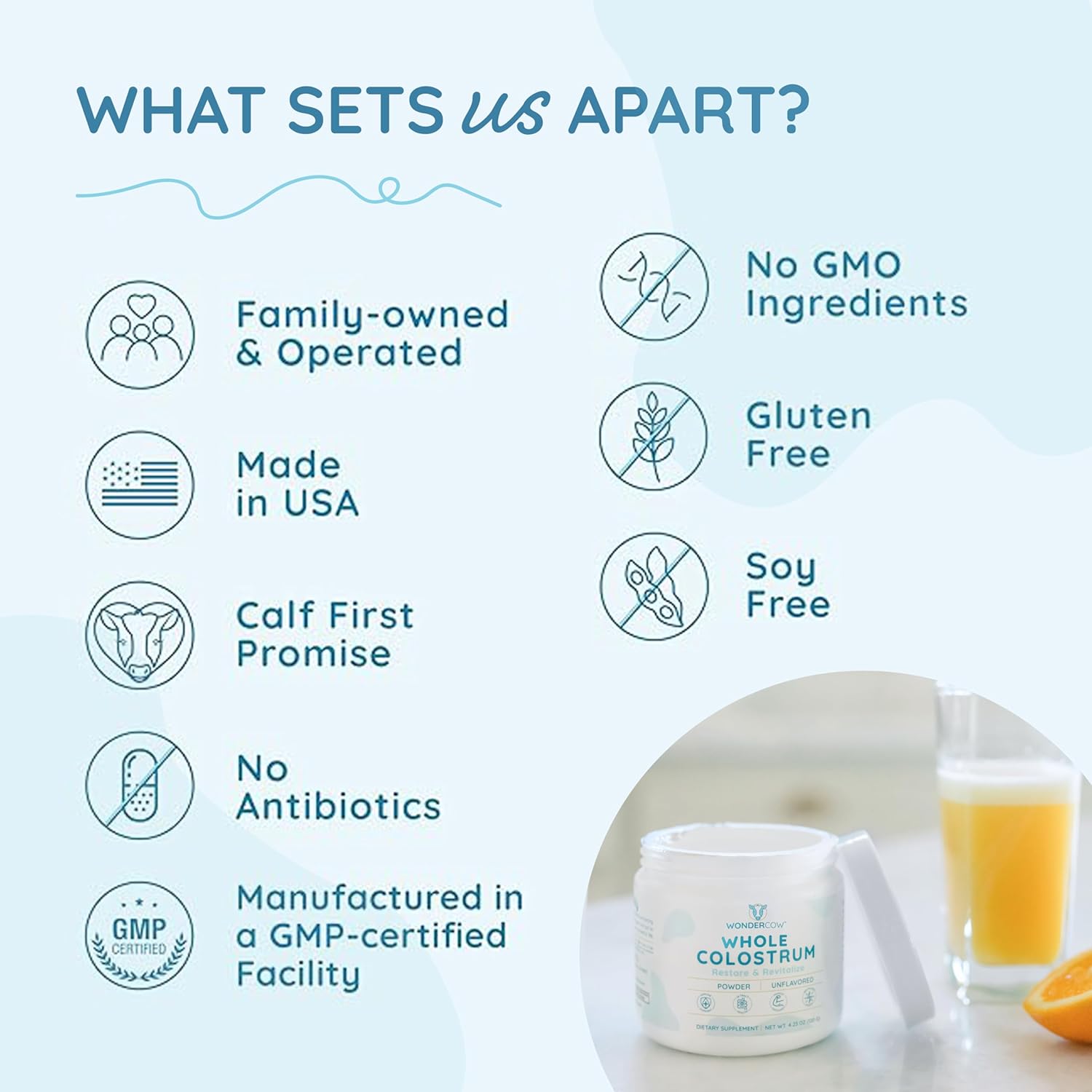 - The WonderCow Promise: We source our bovine colostrum from sustainable, reputable farms that use ethical and humane farming practices. Our product contains no artificial ingredients, sweeteners, dyes, additives, or fillers – just pure, high-quality colostrum powder. Additionally, we follow our Calf-First Promise, ensuring that the newborn calves receive the colostrum they need before we collect any excess. This means that our colostrum is not only effective, but also sustainable and ethical.